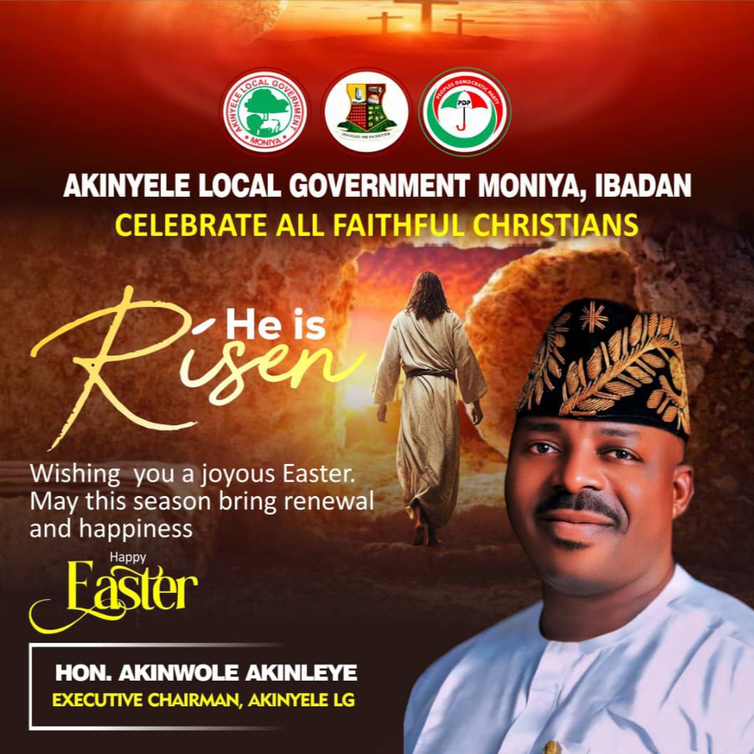 The Executive Chairman of Akinyele Local Government, Hon. Akinwole Akinleye, has extended warm Easter greetings to Christians and all residents of Akinyele, urging them to reflect on the significance of the season and embrace the enduring values of unity, love, and togetherness.