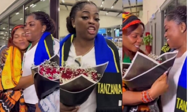 The actresses have finally arrived in the country and were received in grand style by Iyabo Ojo. In an online clip, Iyabo is seen hugging Funke as she presents her with flowers and a cape.