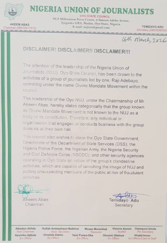 The Nigeria Union of Journalists (NUJ), Oyo State Council, has disassociated itself from a group operating under the name “Divine Mandate Movement,” declaring that it is not recognised by the union.