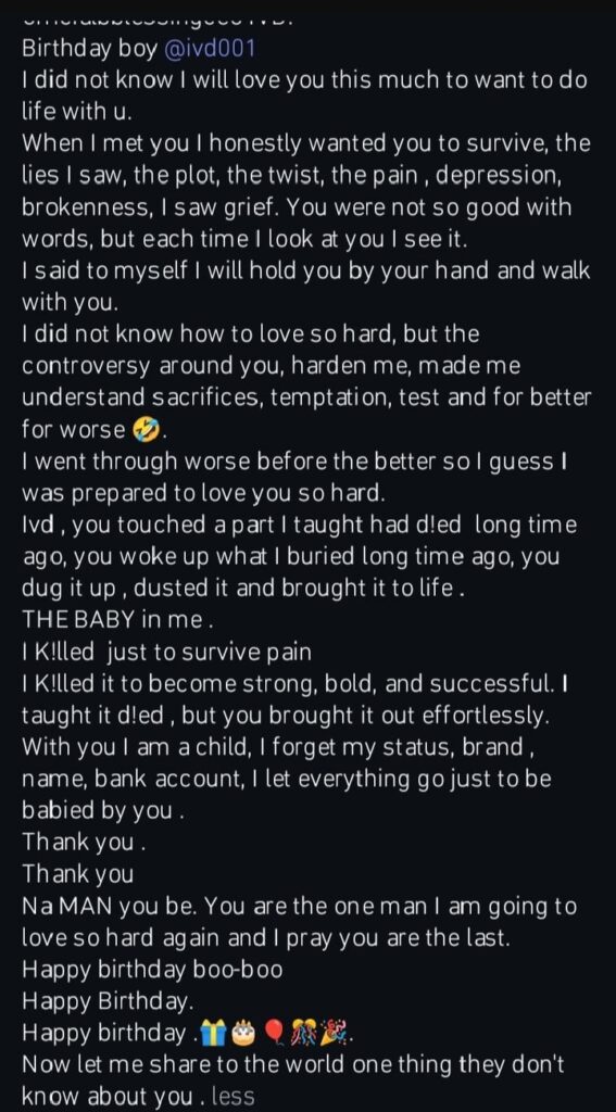 She further revealed that she didn’t know how to love this hard, but the controversy around him hardened her and made her understand sacrifices. She noted how she went through worse before the better so she was prepared to love him so hard.